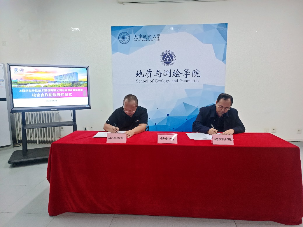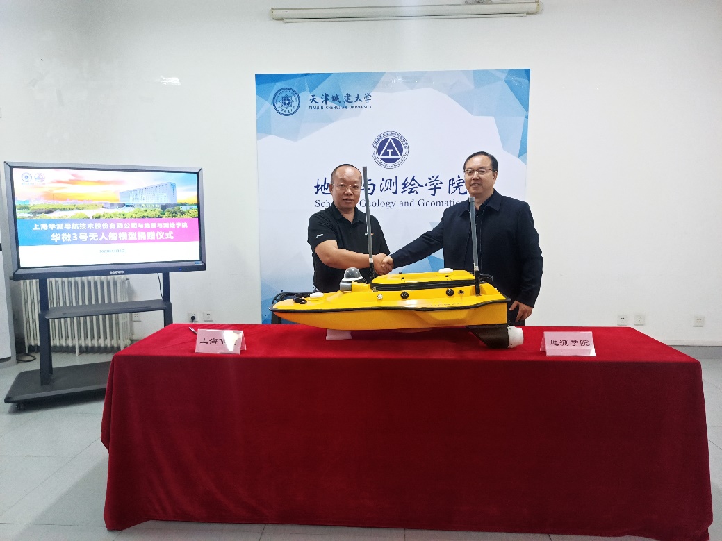 随后,双方就校企合作、产教融合、团队培训、技术研发以及成果转化等方面展开深入讨论并达成合作意向。汪东川和胡炜代表双方共同签署了合作协议,上海华测导航技术股份有限公司向公司科普基地捐赠由该公司自主研发的无人船模型(APACHE 3)一台,用于国产新型测绘装备和技术的科普教育和宣传。